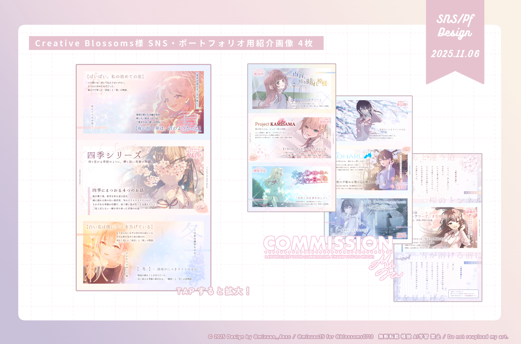 「SNS・ポートフォリオ用紹介画像 4点」ゲーム制作サークルCreative Blossoms様のSNS紹介用の画像・ポートフォリオ用画像を制作いたしました。タップすると上下が見える仕様です。