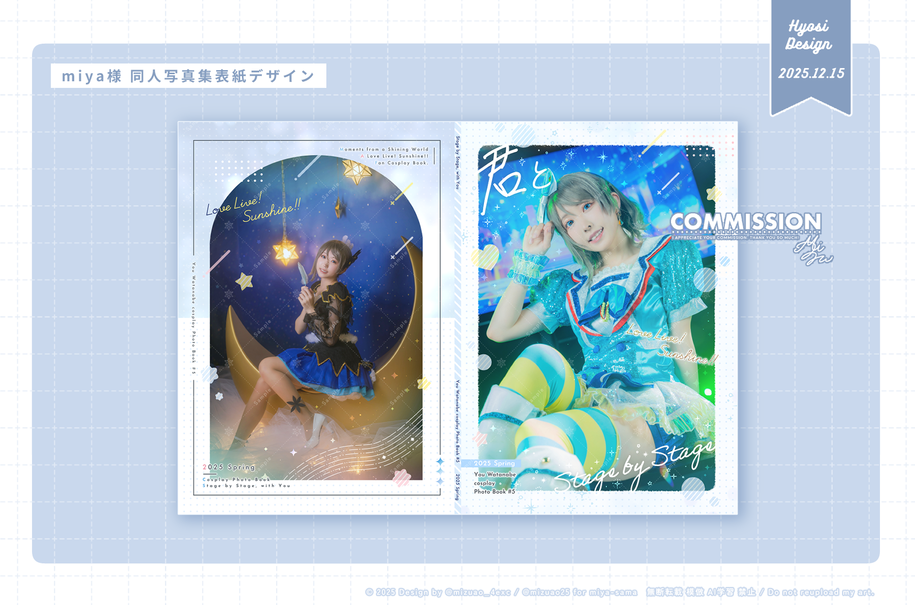 「同人写真集 表紙デザイン」同人写真集の表紙デザインを担当いたしました。水色やマリンテイストのキャラクター性やご依頼者様の好みに沿って制作させていただきました。